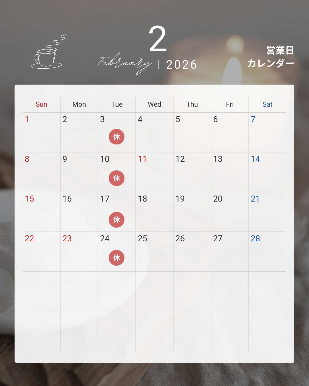 月、火曜日 ※ 臨時休業はInstagramでお知らせします。 |